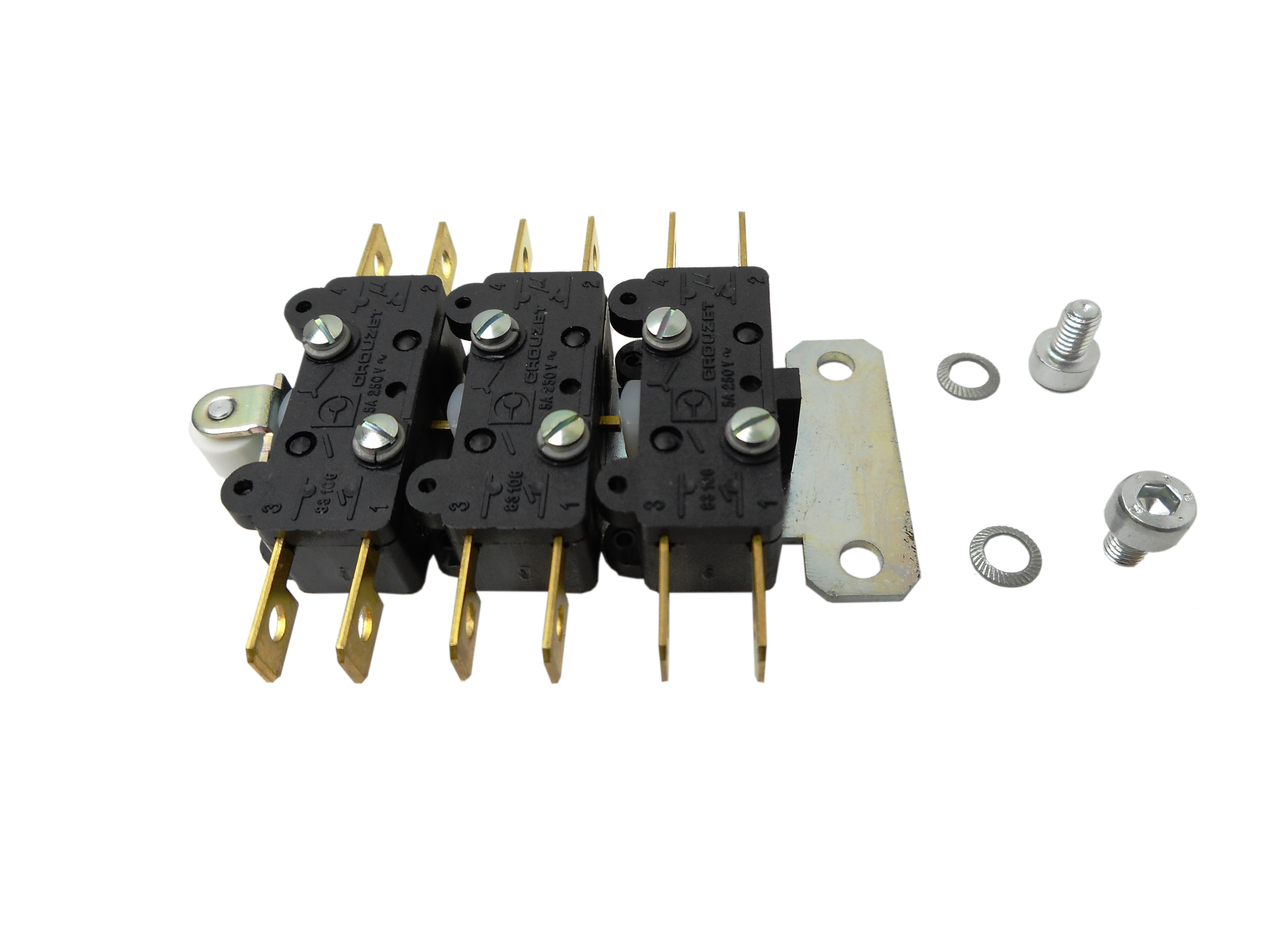 Eigenschappen - microschakelaar - type "break before make" - bediend door een hendeltje met wiel - op bijpassend metalen steuntje